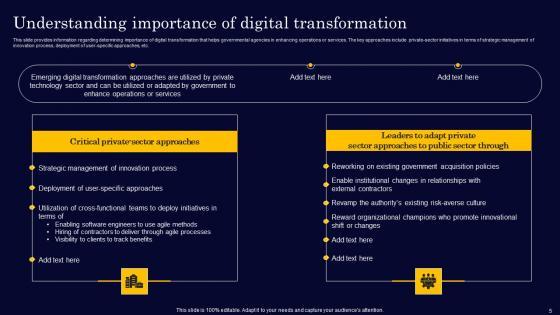 This slide provides information regarding determining importance of digital transformation that helps governmental agencies in enhancing operations or services. The key approaches include private-sector initiatives in terms of strategic management of innovation process, deployment of user-specific approaches, etc. Take your projects to the next level with our ultimate collection of Understanding Importance Of Digital Transformation Gen Tech Stack Playbook Microsoft Pdf. Slidegeeks has designed a range of layouts that are perfect for representing task or activity duration, keeping track of all your deadlines at a glance. Tailor these designs to your exact needs and give them a truly corporate look with your own brand colors they will make your projects stand out from the rest This slide provides information regarding determining importance of digital transformation that helps governmental agencies in enhancing operations or services. The key approaches include private-sector initiatives in terms of strategic management of innovation process, deployment of user-specific approaches, etc.