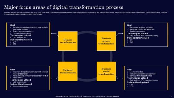 This slide provides information regarding key focus areas of the digital transformation process along with respective goals, technologies utilized and stakeholders involved. The focus areas include domain transformation, cultural transformation, business process transformation and business model transformation. Whether you have daily or monthly meetings, a brilliant presentation is necessary. Major Focus Areas Of Digital Transformation Process Gen Tech Stack Playbook Summary Pdf can be your best option for delivering a presentation. Represent everything in detail using Major Focus Areas Of Digital Transformation Process Gen Tech Stack Playbook Summary Pdf and make yourself stand out in meetings. The template is versatile and follows a structure that will cater to your requirements. All the templates prepared by Slidegeeks are easy to download and edit. Our research experts have taken care of the corporate themes as well. So, give it a try and see the results. This slide provides information regarding key focus areas of the digital transformation process along with respective goals, technologies utilized and stakeholders involved. The focus areas include domain transformation, cultural transformation, business process transformation and business model transformation.