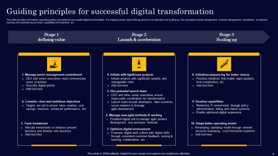 This slide provides information regarding guiding principles for successful digital transformation. The stages include value defining, launch and acceleration and scaling up. Key principles include management of senior management commitment, investment tracking, hire potential launch team, capabilities development, etc. Get a simple yet stunning designed Guiding Principles For Successful Digital Gen Tech Stack Playbook Formats Pdf. It is the best one to establish the tone in your meetings. It is an excellent way to make your presentations highly effective. So, download this PPT today from Slidegeeks and see the positive impacts. Our easy-to-edit Guiding Principles For Successful Digital Gen Tech Stack Playbook Formats Pdfcan be your go-to option for all upcoming conferences and meetings. So, what are you waiting for Grab this template today. This slide provides information regarding guiding principles for successful digital transformation. The stages include value defining, launch and acceleration and scaling up. Key principles include management of senior management commitment, investment tracking, hire potential launch team, capabilities development, etc.