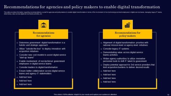 This slide provides information regarding recommendations crucial for agencies and policymakers to enable digital transformation in terms of the involvement of non-technical government employees in digital service teams, managing legacy IT teams, determining value across digital service teams activities, etc. Presenting this PowerPoint presentation, titled Recommendations For Agencies And Policy Makers To Gen Tech Stack Playbook Themes Pdf, with topics curated by our researchers after extensive research. This editable presentation is available for immediate download and provides attractive features when used. Download now and captivate your audience. Presenting this Recommendations For Agencies And Policy Makers To Gen Tech Stack Playbook Themes Pdf. Our researchers have carefully researched and created these slides with all aspects taken into consideration. This is a completely customizable Recommendations For Agencies And Policy Makers To Gen Tech Stack Playbook Themes Pdf that is available for immediate downloading. Download now and make an impact on your audience. Highlight the attractive features available with our PPTs. This slide provides information regarding recommendations crucial for agencies and policymakers to enable digital transformation in terms of the involvement of non-technical government employees in digital service teams, managing legacy IT teams, determining value across digital service teams activities, etc.