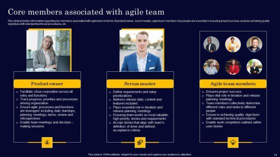 This slide provides information regarding key members associated with agile team in terms of product owner, scrum master, agile team members. Key people are essential in ensuring project success, assures achieving quality objectives with standard technical procedures, etc. Slidegeeks is one of the best resources for PowerPoint templates. You can download easily and regulate Core Members Associated With Agile Team Gen Tech Stack Playbook Sample Pdf for your personal presentations from our wonderful collection. A few clicks is all it takes to discover and get the most relevant and appropriate templates. Use our Templates to add a unique zing and appeal to your presentation and meetings. All the slides are easy to edit and you can use them even for advertisement purposes. This slide provides information regarding key members associated with agile team in terms of product owner, scrum master, agile team members. Key people are essential in ensuring project success, assures achieving quality objectives with standard technical procedures, etc.