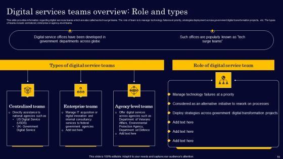 This slide provides information regarding digital services teams which are also called as tech surge teams. The role of team is to manage technology failures at priority, strategies deployment across government digital transformation projects, etc. The types of teams include centralized, enterprise or agency-level teams. There are so many reasons you need a Digital Services Teams Overview Role And Types Gen Tech Stack Playbook Formats Pdf. The first reason is you can not spend time making everything from scratch, Thus, Slidegeeks has made presentation templates for you too. You can easily download these templates from our website easily. This slide provides information regarding digital services teams which are also called as tech surge teams. The role of team is to manage technology failures at priority, strategies deployment across government digital transformation projects, etc. The types of teams include centralized, enterprise or agency-level teams.