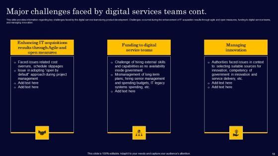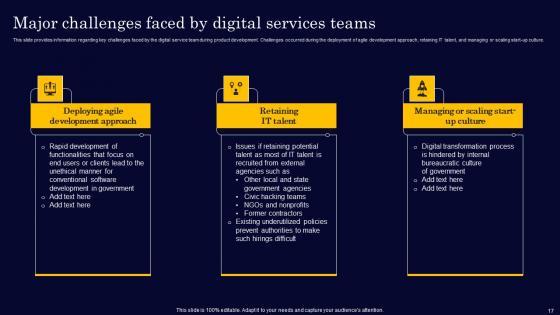 This slide provides information regarding key challenges faced by the digital service team during product development. Challenges occurred during the deployment of agile development approach, retaining IT talent, and managing or scaling start-up culture. Do you have an important presentation coming up Are you looking for something that will make your presentation stand out from the rest Look no further than Major Challenges Faced By Digital Services Teams Gen Tech Stack Playbook Slides Pdf. With our professional designs, you can trust that your presentation will pop and make delivering it a smooth process. And with Slidegeeks, you can trust that your presentation will be unique and memorable. So why wait Grab Major Challenges Faced By Digital Services Teams Gen Tech Stack Playbook Slides Pdf today and make your presentation stand out from the rest This slide provides information regarding key challenges faced by the digital service team during product development. Challenges occurred during the deployment of agile development approach, retaining IT talent, and managing or scaling start-up culture.