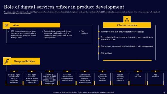 This slide provides information regarding role of digital service officer who is considered as a trusted leader to implement strategy and service design efforts. DSO is considered as a visionary leader and a team player who communicate with department leaders to manage digital service initiatives. Here you can discover an assortment of the finest PowerPoint and Google Slides templates. With these templates, you can create presentations for a variety of purposes while simultaneously providing your audience with an eye-catching visual experience. Download Role Of Digital Services Officer In Product Development Gen Tech Stack Playbook Designs Pdf to deliver an impeccable presentation. These templates will make your job of preparing presentations much quicker, yet still, maintain a high level of quality. Slidegeeks has experienced researchers who prepare these templates and write high-quality content for you. Later on, you can personalize the content by editing the Role Of Digital Services Officer In Product Development Gen Tech Stack Playbook Designs Pdf. This slide provides information regarding role of digital service officer who is considered as a trusted leader to implement strategy and service design efforts. DSO is considered as a visionary leader and a team player who communicate with department leaders to manage digital service initiatives.