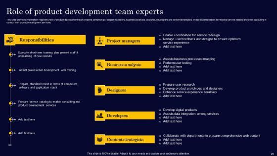 This slide provides information regarding role of product development team experts comprising of project managers, business analysts, designer, developers and content strategists. These experts help in developing service catalog and offer consulting in context with product development services. This Role Of Product Development Team Experts Gen Tech Stack Playbook Demonstration Pdf from Slidegeeks makes it easy to present information on your topic with precision. It provides customization options, so you can make changes to the colors, design, graphics, or any other component to create a unique layout. It is also available for immediate download, so you can begin using it right away. Slidegeeks has done good research to ensure that you have everything you need to make your presentation stand out. Make a name out there for a brilliant performance. This slide provides information regarding role of product development team experts comprising of project managers, business analysts, designer, developers and content strategists. These experts help in developing service catalog and offer consulting in context with product development services.