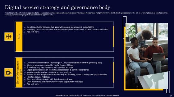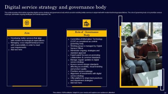 This slide provides information regarding digital service strategy and governance body which assist in building better services in alignment with modern technology expectations. The role of governing body is to prioritize service redesign, administer ongoing strategies and stands approvals, etc. Want to ace your presentation in front of a live audience Our Digital Service Strategy And Governance Body Gen Tech Stack Playbook Information Pdf can help you do that by engaging all the users towards you. Slidegeeks experts have put their efforts and expertise into creating these impeccable powerpoint presentations so that you can communicate your ideas clearly. Moreover, all the templates are customizable, and easy-to-edit and downloadable. Use these for both personal and commercial use. This slide provides information regarding digital service strategy and governance body which assist in building better services in alignment with modern technology expectations. The role of governing body is to prioritize service redesign, administer ongoing strategies and stands approvals, etc.