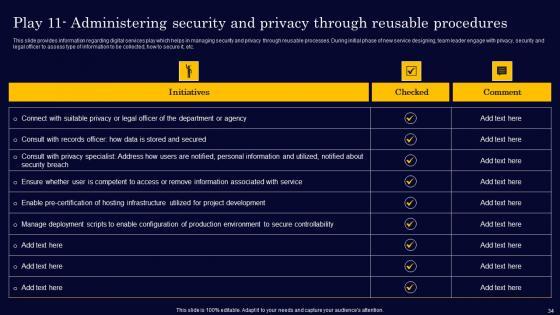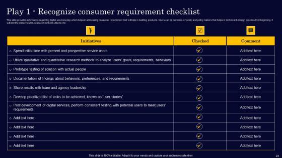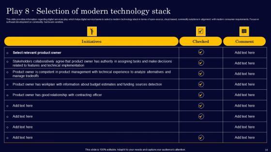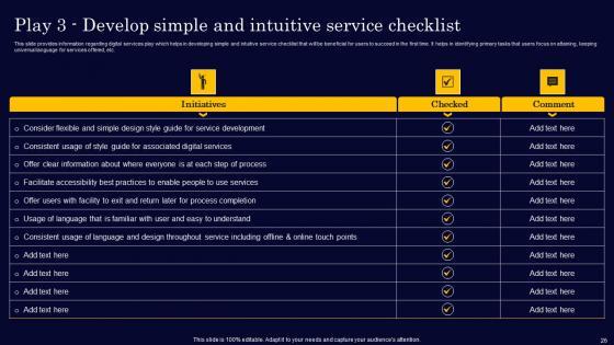 This slide provides information regarding digital services play which helps in developing simple and intuitive service checklist that will be beneficial for users to succeed in the first time. It helps in identifying primary tasks that users focus on attaining, keeping universal language for services offered, etc. This modern and well-arranged Play 3 Develop Simple And Intuitive Service Checklist Gen Tech Stack Playbook Rules Pdf provides lots of creative possibilities. It is very simple to customize and edit with the Powerpoint Software. Just drag and drop your pictures into the shapes. All facets of this template can be edited with Powerpoint, no extra software is necessary. Add your own material, put your images in the places assigned for them, adjust the colors, and then you can show your slides to the world, with an animated slide included. This slide provides information regarding digital services play which helps in developing simple and intuitive service checklist that will be beneficial for users to succeed in the first time. It helps in identifying primary tasks that users focus on attaining, keeping universal language for services offered, etc.