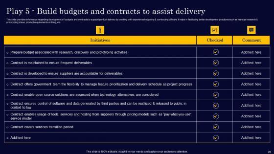 This slide provides information regarding development of budgets and contracts to support product delivery by working with experience budgeting and contracting officers. It helps in facilitating better development practices such as manage research and prototyping phase, product requirements refining, etc. Welcome to our selection of the Play 5 Build Budgets And Contracts To Assist Delivery Gen Tech Stack Playbook Demonstration Pdf. These are designed to help you showcase your creativity and bring your sphere to life. Planning and Innovation are essential for any business that is just starting out. This collection contains the designs that you need for your everyday presentations. All of our PowerPoints are 100 percent editable, so you can customize them to suit your needs. This multi-purpose template can be used in various situations. Grab these presentation templates today This slide provides information regarding development of budgets and contracts to support product delivery by working with experience budgeting and contracting officers. It helps in facilitating better development practices such as manage research and prototyping phase, product requirements refining, etc.