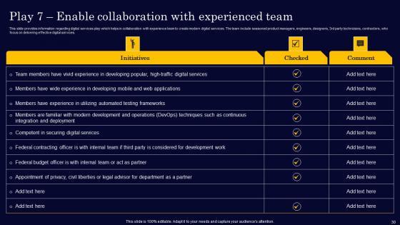 This slide provides information regarding digital services play which helps in collaboration with experience team to create modern digital services. The team include seasoned product managers, engineers, designers, 3rd party technicians, contractors, who focus on delivering effective digital services. The best PPT templates are a great way to save time, energy, and resources. Slidegeeks have 100 percent editable powerpoint slides making them incredibly versatile. With these quality presentation templates, you can create a captivating and memorable presentation by combining visually appealing slides and effectively communicating your message. Download Play 7 Enable Collaboration With Experienced Team Gen Tech Stack Playbook Rules Pdf from Slidegeeks and deliver a wonderful presentation. This slide provides information regarding digital services play which helps in collaboration with experience team to create modern digital services. The team include seasoned product managers, engineers, designers, 3rd party technicians, contractors, who focus on delivering effective digital services.