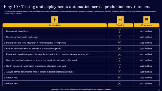 This slide provides information regarding digital services play which helps in handling testing and deployments automation in production environment. Developers utilize automated performance tests to track traffic surge and performance bottlenecks and consistent updates to service. Are you in need of a template that can accommodate all of your creative concepts This one is crafted professionally and can be altered to fit any style. Use it with Google Slides or PowerPoint. Include striking photographs, symbols, depictions, and other visuals. Fill, move around, or remove text boxes as desired. Test out color palettes and font mixtures. Edit and save your work, or work with colleagues. Download Play 10 Testing And Deployments Automation Across Gen Tech Stack Playbook Diagrams Pdf and observe how to make your presentation outstanding. Give an impeccable presentation to your group and make your presentation unforgettable. This slide provides information regarding digital services play which helps in handling testing and deployments automation in production environment. Developers utilize automated performance tests to track traffic surge and performance bottlenecks and consistent updates to service.