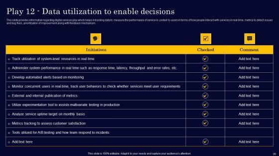 This slide provides information regarding digital services play which helps in tracking data to measure the performance of service in context to users in terms of how people interact with services in real-time, metrics to detect issues and bug fixes, prioritization of improvement along with feedback mechanism. Make sure to capture your audiences attention in your business displays with our gratis customizable Play 12 Data Utilization To Enable Decisions Gen Tech Stack Playbook Graphics Pdf. These are great for business strategies, office conferences, capital raising or task suggestions. If you desire to acquire more customers for your tech business and ensure they stay satisfied, create your own sales presentation with these plain slides. This slide provides information regarding digital services play which helps in tracking data to measure the performance of service in context to users in terms of how people interact with services in real-time, metrics to detect issues and bug fixes, prioritization of improvement along with feedback mechanism.