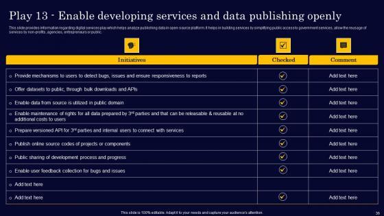 This slide provides information regarding digital services play which helps analyze publishing data in open-source platform. It helps in building services by simplifying public access to government services, allow the reusage of services by non-profits, agencies, entrepreneurs or public. Formulating a presentation can take up a lot of effort and time, so the content and message should always be the primary focus. The visuals of the PowerPoint can enhance the presenters message, so our Play 13 Enable Developing Services And Data Gen Tech Stack Playbook Demonstration Pdf was created to help save time. Instead of worrying about the design, the presenter can concentrate on the message while our designers work on creating the ideal templates for whatever situation is needed. Slidegeeks has experts for everything from amazing designs to valuable content, we have put everything into Play 13 Enable Developing Services And Data Gen Tech Stack Playbook Demonstration Pdf This slide provides information regarding digital services play which helps analyze publishing data in open-source platform. It helps in building services by simplifying public access to government services, allow the reusage of services by non-profits, agencies, entrepreneurs or public.