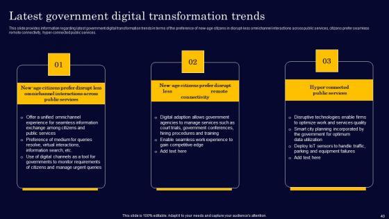 This slide provides information regarding latest government digital transformation trends in terms of the preference of new-age citizens in disrupt-less omnichannel interactions across public services, citizens prefer seamless remote connectivity, hyper-connected public services. Slidegeeks is here to make your presentations a breeze with Latest Government Digital Transformation Trends Gen Tech Stack Playbook Slides Pdf With our easy-to-use and customizable templates, you can focus on delivering your ideas rather than worrying about formatting. With a variety of designs to choose from, you are sure to find one that suits your needs. And with animations and unique photos, illustrations, and fonts, you can make your presentation pop. So whether you are giving a sales pitch or presenting to the board, make sure to check out Slidegeeks first This slide provides information regarding latest government digital transformation trends in terms of the preference of new-age citizens in disrupt-less omnichannel interactions across public services, citizens prefer seamless remote connectivity, hyper-connected public services.