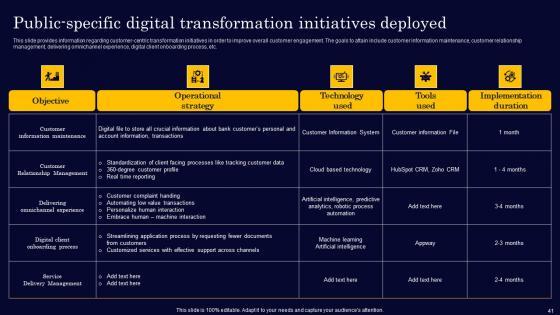 This slide provides information regarding customer-centric transformation initiatives in order to improve overall customer engagement. The goals to attain include customer information maintenance, customer relationship management, delivering omnichannel experience, digital client onboarding process, etc. Slidegeeks has constructed Public Specific Digital Transformation Initiatives Deployed Gen Tech Stack Playbook Brochure Pdf after conducting extensive research and examination. These presentation templates are constantly being generated and modified based on user preferences and critiques from editors. Here, you will find the most attractive templates for a range of purposes while taking into account ratings and remarks from users regarding the content. This is an excellent jumping-off point to explore our content and will give new users an insight into our top-notch PowerPoint Templates. This slide provides information regarding customer-centric transformation initiatives in order to improve overall customer engagement. The goals to attain include customer information maintenance, customer relationship management, delivering omnichannel experience, digital client onboarding process, etc.