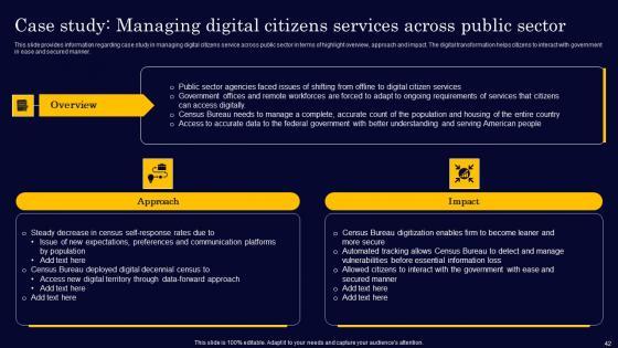 This slide provides information regarding case study in managing digital citizens service across public sector in terms of highlight overview, approach and impact. The digital transformation helps citizens to interact with government in ease and secured manner. Create an editable Case Study Managing Digital Citizens Services Across Gen Tech Stack Playbook Summary Pdf that communicates your idea and engages your audience. Whether you are presenting a business or an educational presentation, pre-designed presentation templates help save time. Case Study Managing Digital Citizens Services Across Gen Tech Stack Playbook Summary Pdf is highly customizable and very easy to edit, covering many different styles from creative to business presentations. Slidegeeks has creative team members who have crafted amazing templates. So, go and get them without any delay. This slide provides information regarding case study in managing digital citizens service across public sector in terms of highlight overview, approach and impact. The digital transformation helps citizens to interact with government in ease and secured manner.