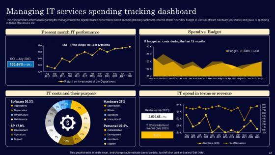 This slide provides information regarding the management of the digital services performance and IT spending tracking dashboard in terms of ROI, spend vs. budget, IT costs software, hardware, personnel and goals, IT spending in terms of revenues, etc. If your project calls for a presentation, then Slidegeeks is your go-to partner because we have professionally designed, easy-to-edit templates that are perfect for any presentation. After downloading, you can easily edit Managing It Services Spending Tracking Dashboard Gen Tech Stack Playbook Inspiration Pdf and make the changes accordingly. You can rearrange slides or fill them with different images. Check out all the handy templates This slide provides information regarding the management of the digital services performance and IT spending tracking dashboard in terms of ROI, spend vs. budget, IT costs software, hardware, personnel and goals, IT spending in terms of revenues, etc.