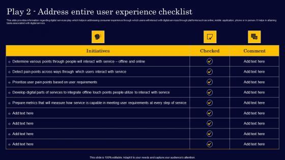 This slide provides information regarding digital services play which helps in addressing consumer experience through which users will interact with digital services through platforms such as online, mobile application, phone or in person. It helps in attaining tasks associated with digital service. Coming up with a presentation necessitates that the majority of the effort goes into the content and the message you intend to convey. The visuals of a PowerPoint presentation can only be effective if it supplements and supports the story that is being told. Keeping this in mind our experts created Play 2 Address Entire User Experience Checklist Gen Tech Stack Playbook Structure Pdf to reduce the time that goes into designing the presentation. This way, you can concentrate on the message while our designers take care of providing you with the right template for the situation. This slide provides information regarding digital services play which helps in addressing consumer experience through which users will interact with digital services through platforms such as online, mobile application, phone or in person. It helps in attaining tasks associated with digital service.