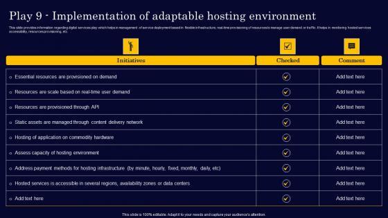This slide provides information regarding digital services play which helps in management of service deployment based in flexible infrastructure, real-time provisioning of resources to manage user demand or traffic. It helps in monitoring hosted services accessibility, resources provisioning, etc. Are you searching for a Play 9 Implementation Of Adaptable Hosting Gen Tech Stack Playbook Sample Pdf that is uncluttered, straightforward, and original Its easy to edit, and you can change the colors to suit your personal or business branding. For a presentation that expresses how much effort you have put in, this template is ideal With all of its features, including tables, diagrams, statistics, and lists, its perfect for a business plan presentation. Make your ideas more appealing with these professional slides. Download Play 9 Implementation Of Adaptable Hosting Gen Tech Stack Playbook Sample Pdf from Slidegeeks today. This slide provides information regarding digital services play which helps in management of service deployment based in flexible infrastructure, real-time provisioning of resources to manage user demand or traffic. It helps in monitoring hosted services accessibility, resources provisioning, etc.