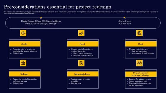 This slide provides information regarding pre-requisites vital for project redesign in terms of scale, need, cost, volume, meaningfulness and project cost for strategic redesign. The pre-considerations helps in determining size of target user population for service utilization, assess transactions count, etc. Retrieve professionally designed Pre Considerations Essential For Project Redesign Gen Tech Stack Playbook Pictures Pdf to effectively convey your message and captivate your listeners. Save time by selecting pre-made slideshows that are appropriate for various topics, from business to educational purposes. These themes come in many different styles, from creative to corporate, and all of them are easily adjustable and can be edited quickly. Access them as PowerPoint templates or as Google Slides themes. You do not have to go on a hunt for the perfect presentation because Slidegeeks got you covered from everywhere. This slide provides information regarding pre-requisites vital for project redesign in terms of scale, need, cost, volume, meaningfulness and project cost for strategic redesign. The pre-considerations helps in determining size of target user population for service utilization, assess transactions count, etc.