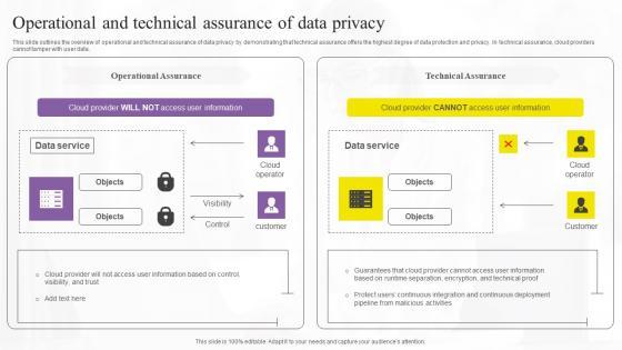 This slide outlines the overview of operational and technical assurance of data privacy by demonstrating that technical assurance offers the highest degree of data protection and privacy. In technical assurance, cloud providers cannot tamper with user data. Get a simple yet stunning designed Operational And Technical Assurance Of Data Privacy Secure Computing Framework Mockup Pdf. It is the best one to establish the tone in your meetings. It is an excellent way to make your presentations highly effective. So, download this PPT today from Slidegeeks and see the positive impacts. Our easy-to-edit Operational And Technical Assurance Of Data Privacy Secure Computing Framework Mockup Pdf can be your go-to option for all upcoming conferences and meetings. So, what are you waiting for Grab this template today. This slide outlines the overview of operational and technical assurance of data privacy by demonstrating that technical assurance offers the highest degree of data protection and privacy. In technical assurance, cloud providers cannot tamper with user data.