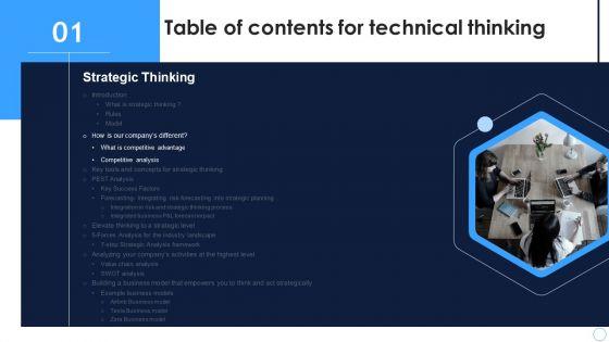 Are you in need of a template that can accommodate all of your creative concepts This one is crafted professionally and can be altered to fit any style. Use it with Google Slides or PowerPoint. Include striking photographs, symbols, depictions, and other visuals. Fill, move around, or remove text boxes as desired. Test out color palettes and font mixtures. Edit and save your work, or work with colleagues. Download Technical Thinking Table Of Contents For Technical Thinking Ppt Pictures Display PDF and observe how to make your presentation outstanding. Give an impeccable presentation to your group and make your presentation unforgettable.