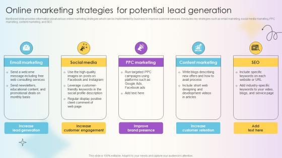 Mentioned slide provides information about various online marketing strategies which can be implemented by business to improve customer services. It includes key strategies such as email marketing, social media marketing, PPC marketing, content marketing, and SEO. Slidegeeks is one of the best resources for PowerPoint templates. You can download easily and regulate Managing Technical And Non Online Marketing Strategies For Potential Lead Generation for your personal presentations from our wonderful collection. A few clicks is all it takes to discover and get the most relevant and appropriate templates. Use our Templates to add a unique zing and appeal to your presentation and meetings. All the slides are easy to edit and you can use them even for advertisement purposes. Mentioned slide provides information about various online marketing strategies which can be implemented by business to improve customer services. It includes key strategies such as email marketing, social media marketing, PPC marketing, content marketing, and SEO.