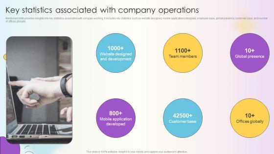 Mentioned slide provides insights into key statistics associated with company working. It includes key statistics such as website designed, mobile applications designed, employee base, global presence, customer base, and number of offices globally. Here you can discover an assortment of the finest PowerPoint and Google Slides templates. With these templates, you can create presentations for a variety of purposes while simultaneously providing your audience with an eye-catching visual experience. Download Managing Technical And Non Key Statistics Associated With Company Operations to deliver an impeccable presentation. These templates will make your job of preparing presentations much quicker, yet still, maintain a high level of quality. Slidegeeks has experienced researchers who prepare these templates and write high-quality content for you. Later on, you can personalize the content by editing the Managing Technical And Non Key Statistics Associated With Company Operations. Mentioned slide provides insights into key statistics associated with company working. It includes key statistics such as website designed, mobile applications designed, employee base, global presence, customer base, and number of offices globally.