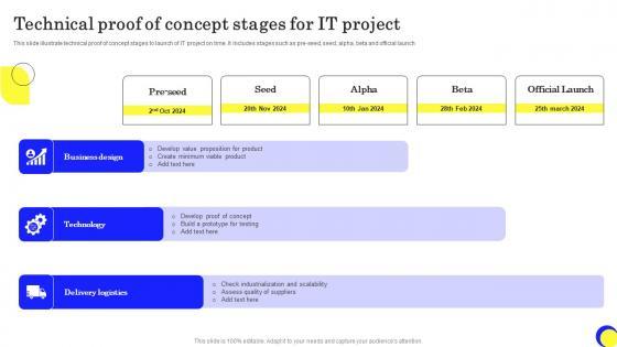 This slide illustrate technical proof of concept stages to launch of IT project on time. It includes stages such as pre-seed, seed, alpha, beta and official launch. Pitch your topic with ease and precision using this Technical Proof Of Concept Stages For IT Project Ppt Styles Slides Pdf. This layout presents information on Pre Seed, Seed, Alpha, Beta, Official Launch. It is also available for immediate download and adjustment. So, changes can be made in the color, design, graphics or any other component to create a unique layout. This slide illustrate technical proof of concept stages to launch of IT project on time. It includes stages such as pre-seed, seed, alpha, beta and official launch.