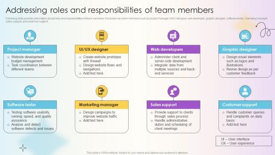 Following slide provides information about roles and responsibilities of team members. It includes key team members such as project manager UI or UX designer, web developer, graphic designer, software tester, marketing manager, sales support, and customer support. There are so many reasons you need a Managing Technical And Non Addressing Roles And Responsibilities Of Team Members. The first reason is you can not spend time making everything from scratch, Thus, Slidegeeks has made presentation templates for you too. You can easily download these templates from our website easily. Following slide provides information about roles and responsibilities of team members. It includes key team members such as project manager UI or UX designer, web developer, graphic designer, software tester, marketing manager, sales support, and customer support.