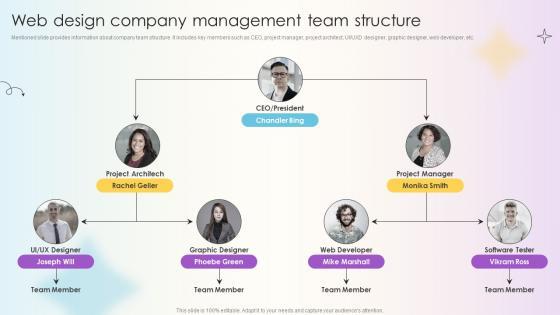 Mentioned slide provides information about company team structure. It includes key members such as CEO, project manager, project architect, UI or UXD designer, graphic designer, web developer, etc. Coming up with a presentation necessitates that the majority of the effort goes into the content and the message you intend to convey. The visuals of a PowerPoint presentation can only be effective if it supplements and supports the story that is being told. Keeping this in mind our experts created Managing Technical And Non Web Design Company Management Team Structure to reduce the time that goes into designing the presentation. This way, you can concentrate on the message while our designers take care of providing you with the right template for the situation. Mentioned slide provides information about company team structure. It includes key members such as CEO, project manager, project architect, UI or UXD designer, graphic designer, web developer, etc.