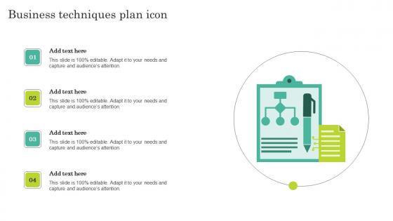 Showcasing this set of slides titled Effective Business Techniques Plan Icon Ppt PowerPoint Presentation Infographic Template Backgrounds PDF. The topics addressed in these templates are Effective Business, Techniques Plan Icon. All the content presented in this PPT design is completely editable. Download it and make adjustments in color, background, font etc. as per your unique business setting.