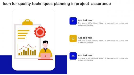 Showcasing this set of slides titled Icon For Quality Techniques Planning In Project Assurance Summary Pdf. The topics addressed in these templates are Icon For Quality ,Techniques Planning. All the content presented in this PPT design is completely editable. Download it and make adjustments in color, background, font etc. as per your unique business setting. Our Icon For Quality Techniques Planning In Project Assurance Summary Pdf are topically designed to provide an attractive backdrop to any subject. Use them to look like a presentation pro.