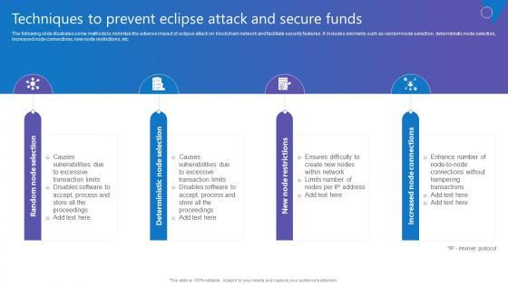 The following slide illustrates some methods to minimize the adverse impact of eclipse attack on blockchain network and facilitate security features. It includes elements such as random node selection, deterministic node selection, increased node connections, new node restrictions, etc. Create an editable Techniques To Prevent Eclipse Comprehensive Guide To Blockchain Digital Security Formats Pdf that communicates your idea and engages your audience. Whether you are presenting a business or an educational presentation, pre designed presentation templates help save time. Techniques To Prevent Eclipse Comprehensive Guide To Blockchain Digital Security Formats Pdf is highly customizable and very easy to edit, covering many different styles from creative to business presentations. Slidegeeks has creative team members who have crafted amazing templates. So, go and get them without any delay. The following slide illustrates some methods to minimize the adverse impact of eclipse attack on blockchain network and facilitate security features. It includes elements such as random node selection, deterministic node selection, increased node connections, new node restrictions, etc.