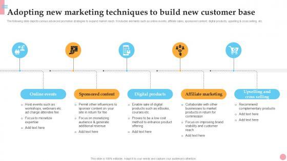 The following slide depicts various advanced promotion strategies to expand market reach. It includes elements such as online events, affiliate sales, sponsored content, digital products, upselling and cross selling, etc. Find a pre-designed and impeccable Adopting New Marketing Techniques How To Improve Company PPT Presentation Strategy SS V. The templates can ace your presentation without additional effort. You can download these easy-to-edit presentation templates to make your presentation stand out from others. So, what are you waiting for Download the template from Slidegeeks today and give a unique touch to your presentation. The following slide depicts various advanced promotion strategies to expand market reach. It includes elements such as online events, affiliate sales, sponsored content, digital products, upselling and cross selling, etc.