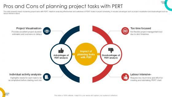 This slide presents impact of planning project tasks with PERT, helpful in analysing effectiveness and usefulness of PERT charts in project scheduling. It includes advantages such as project visualisation and disadvantages such as labour intensive nature. Here you can discover an assortment of the finest PowerPoint and Google Slides templates. With these templates, you can create presentations for a variety of purposes while simultaneously providing your audience with an eye-catching visual experience. Download Pros And Cons Of Planning Project Schedule Management Techniques PPT Sample to deliver an impeccable presentation. These templates will make your job of preparing presentations much quicker, yet still, maintain a high level of quality. Slidegeeks has experienced researchers who prepare these templates and write high-quality content for you. Later on, you can personalize the content by editing the Pros And Cons Of Planning Project Schedule Management Techniques PPT Sample. This slide presents impact of planning project tasks with PERT, helpful in analysing effectiveness and usefulness of PERT charts in project scheduling. It includes advantages such as project visualisation and disadvantages such as labour intensive nature.