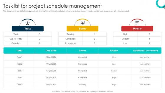 This slide presents task list for tracking project activities, helpful in prioritizing tasks that are critical for project completion. It includes tracking tasks based on due date, status and priority. Slidegeeks is here to make your presentations a breeze with Task List For Project Schedule Management Techniques PPT Template With our easy-to-use and customizable templates, you can focus on delivering your ideas rather than worrying about formatting. With a variety of designs to choose from, you are sure to find one that suits your needs. And with animations and unique photos, illustrations, and fonts, you can make your presentation pop. So whether you are giving a sales pitch or presenting to the board, make sure to check out Slidegeeks first This slide presents task list for tracking project activities, helpful in prioritizing tasks that are critical for project completion. It includes tracking tasks based on due date, status and priority.