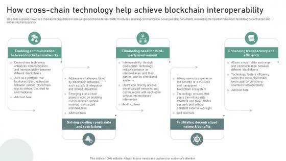 This slide explains how cross chain technology helps in achieving blockchain interoperability. It includes enabling communication, solving existing constraints, eliminating third party involvement, facilitating decentralized and enhancing transparency. If your project calls for a presentation, then Slidegeeks is your go-to partner because we have professionally designed, easy-to-edit templates that are perfect for any presentation. After downloading, you can easily edit Understanding Various Blockchain How Cross Chain Technology Help Achieve Blockchain BCT SS V and make the changes accordingly. You can rearrange slides or fill them with different images. Check out all the handy templates This slide explains how cross chain technology helps in achieving blockchain interoperability. It includes enabling communication, solving existing constraints, eliminating third party involvement, facilitating decentralized and enhancing transparency.