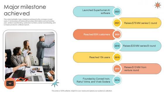 This slide highlights major milestones achieved by the company in past years. It showcases a timeline with provides information such as founding year, venture round funding, customers numbers, series round funding, and company product AI software launch. If you are looking for a format to display your unique thoughts, then the professionally designed Major Milestone Achieved Email Management Technology Pitch Deck is the one for you. You can use it as a Google Slides template or a PowerPoint template. Incorporate impressive visuals, symbols, images, and other charts. Modify or reorganize the text boxes as you desire. Experiment with shade schemes and font pairings. Alter, share or cooperate with other people on your work. Download Major Milestone Achieved Email Management Technology Pitch Deck and find out how to give a successful presentation. Present a perfect display to your team and make your presentation unforgettable. This slide highlights major milestones achieved by the company in past years. It showcases a timeline with provides information such as founding year, venture round funding, customers numbers, series round funding, and company product AI software launch.