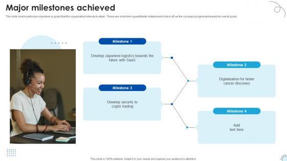 The slide covers particular objectives or goals that the organization intends to attain. These are short-term quantifiable milestones to check off as the company progresses toward its overall goals. If you are looking for a format to display your unique thoughts, then the professionally designed Major Milestones Achieved Technology Solutions Provider Investor Funding Elevator Pitch Deck is the one for you. You can use it as a Google Slides template or a PowerPoint template. Incorporate impressive visuals, symbols, images, and other charts. Modify or reorganize the text boxes as you desire. Experiment with shade schemes and font pairings. Alter, share or cooperate with other people on your work. Download Major Milestones Achieved Technology Solutions Provider Investor Funding Elevator Pitch Deck and find out how to give a successful presentation. Present a perfect display to your team and make your presentation unforgettable. The slide covers particular objectives or goals that the organization intends to attain. These are short-term quantifiable milestones to check off as the company progresses toward its overall goals.