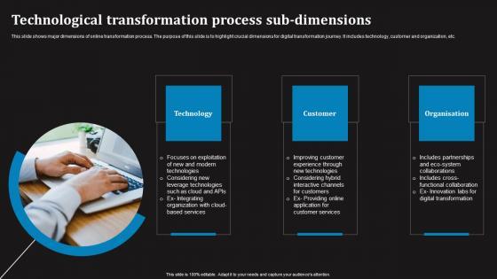 This slide shows major dimensions of online transformation process. The purpose of this slide is to highlight crucial dimensions for digital transformation journey. It includes technology, customer and organization, etc. Pitch your topic with ease and precision using this Technological Transformation Process Sub Dimensions Information Pdf This layout presents information on Technology, Customer, Organisation It is also available for immediate download and adjustment. So, changes can be made in the color, design, graphics or any other component to create a unique layout. This slide shows major dimensions of online transformation process. The purpose of this slide is to highlight crucial dimensions for digital transformation journey. It includes technology, customer and organization, etc.