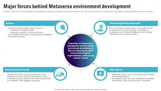 This slide provides information regarding building forces associated with metaverse including actions, technological development, pop culture, socioeconomic trends. These elements are responsible in handling of metaverse popularity at wider aspect. Slidegeeks is one of the best resources for PowerPoint templates. You can download easily and regulate Major Forces Behind Metaverse Environment Continuum Of Technology Revamping Business AI SS V for your personal presentations from our wonderful collection. A few clicks is all it takes to discover and get the most relevant and appropriate templates. Use our Templates to add a unique zing and appeal to your presentation and meetings. All the slides are easy to edit and you can use them even for advertisement purposes. This slide provides information regarding building forces associated with metaverse including actions, technological development, pop culture, socioeconomic trends. These elements are responsible in handling of metaverse popularity at wider aspect.