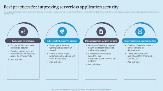 The purpose of this slide is to discuss the best practices to enhance the security of serverless applications. These are safeguard critical data, add an incident response strategy, use appropriate security logging and dependence on external parties. Crafting an eye catching presentation has never been more straightforward. Let your presentation shine with this tasteful yet straightforward Best Practices For Improving Role Serverless Computing Modern Technology Infographics Pdf template. It offers a minimalistic and classy look that is great for making a statement. The colors have been employed intelligently to add a bit of playfulness while still remaining professional. Construct the ideal Best Practices For Improving Role Serverless Computing Modern Technology Infographics Pdf that effortlessly grabs the attention of your audience Begin now and be certain to wow your customers The purpose of this slide is to discuss the best practices to enhance the security of serverless applications. These are safeguard critical data, add an incident response strategy, use appropriate security logging and dependence on external parties.