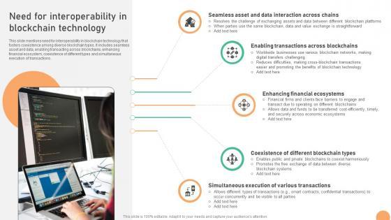 This slide mentions need for interoperability in blockchain technology that fosters coexistence among diverse blockchain types. It includes seamless asset and data, enabling transacting across blockchains, enhancing financial ecosystem, coexistence of different types and simultaneous execution of transactions. Slidegeeks has constructed Seamless Integration The Power Need For Interoperability In Blockchain Technology BCT SS V after conducting extensive research and examination. These presentation templates are constantly being generated and modified based on user preferences and critiques from editors. Here, you will find the most attractive templates for a range of purposes while taking into account ratings and remarks from users regarding the content. This is an excellent jumping-off point to explore our content and will give new users an insight into our top-notch PowerPoint Templates. This slide mentions need for interoperability in blockchain technology that fosters coexistence among diverse blockchain types. It includes seamless asset and data, enabling transacting across blockchains, enhancing financial ecosystem, coexistence of different types and simultaneous execution of transactions.