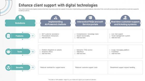 This slide mentions the digital solutions that help improving customer support. It includes implementing ai-powered chatbots, interactive FAQs and self-service portals and real-time customer support and ticketing systems.Retrieve professionally designed Enhance Client Support With Digital Technologies DT SS V to effectively convey your message and captivate your listeners. Save time by selecting pre-made slideshows that are appropriate for various topics, from business to educational purposes. These themes come in many different styles, from creative to corporate, and all of them are easily adjustable and can be edited quickly. Access them as PowerPoint templates or as Google Slides themes. You do not have to go on a hunt for the perfect presentation because Slidegeeks got you covered from everywhere. This slide mentions the digital solutions that help improving customer support. It includes implementing ai-powered chatbots, interactive FAQs and self-service portals and real-time customer support and ticketing systems.