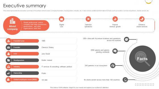 This slide represents the executive summary of Accenture which covers company founders, headquarters, industry, etc. It also shows additional information for facts such as location, number of partners, clients served, etc. Here you can discover an assortment of the finest PowerPoint and Google Slides templates. With these templates, you can create presentations for a variety of purposes while simultaneously providing your audience with an eye-catching visual experience. Download Executive Summary Professional Services And Technology Consulting Ppt Presentation CP SS V to deliver an impeccable presentation. These templates will make your job of preparing presentations much quicker, yet still, maintain a high level of quality. Slidegeeks has experienced researchers who prepare these templates and write high-quality content for you. Later on, you can personalize the content by editing the Executive Summary Professional Services And Technology Consulting Ppt Presentation CP SS V. This slide represents the executive summary of Accenture which covers company founders, headquarters, industry, etc. It also shows additional information for facts such as location, number of partners, clients served, etc.