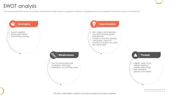 This slide represents SWOT analysis for Accenture showcasing its strength, weakness, opportunity, and threats. It highlights factors such as reputation, client network, lack of communication etc. Get a simple yet stunning designed Swot Analysis Professional Services And Technology Consulting Ppt Slides CP SS V. It is the best one to establish the tone in your meetings. It is an excellent way to make your presentations highly effective. So, download this PPT today from Slidegeeks and see the positive impacts. Our easy-to-edit Swot Analysis Professional Services And Technology Consulting Ppt Slides CP SS V can be your go-to option for all upcoming conferences and meetings. So, what are you waiting for Grab this template today. This slide represents SWOT analysis for Accenture showcasing its strength, weakness, opportunity, and threats. It highlights factors such as reputation, client network, lack of communication etc.