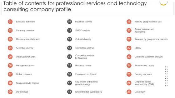 Present like a pro with Table Of Contents For Professional Services And Technology Consulting Company Profile Ppt Slides CP SS V. Create beautiful presentations together with your team, using our easy-to-use presentation slides. Share your ideas in real-time and make changes on the fly by downloading our templates. So whether you are in the office, on the go, or in a remote location, you can stay in sync with your team and present your ideas with confidence. With Slidegeeks presentation got a whole lot easier. Grab these presentations today. Our Table Of Contents For Professional Services And Technology Consulting Company Profile Ppt Slides CP SS V are topically designed to provide an attractive backdrop to any subject. Use them to look like a presentation pro.