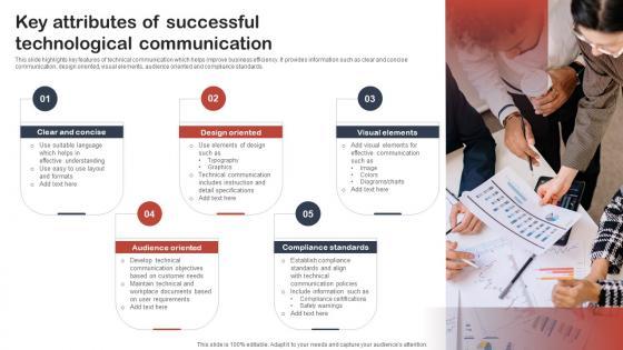 This slide highlights key features of technical communication which helps improve business efficiency. It provides information such as clear and concise communication, design oriented, visual elements, audience oriented and compliance standards. Pitch your topic with ease and precision using this Key Attributes Of Successful Technological Communication Pictures Pdf. This layout presents information on Concise, Design Oriented, Visual Elements. It is also available for immediate download and adjustment. So, changes can be made in the color, design, graphics or any other component to create a unique layout. This slide highlights key features of technical communication which helps improve business efficiency. It provides information such as clear and concise communication, design oriented, visual elements, audience oriented and compliance standards.
