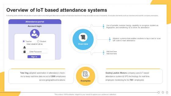 Following slide exhibits introduction of automation and intelligent attendance systems that helps teachers to keep accurate records of students. It includes elements such as overview and real life company examples. Create an editable Overview Of IoT Based Attendance Systems Impact Of IoT Technology On Education IoT SS V that communicates your idea and engages your audience. Whether you are presenting a business or an educational presentation, pre-designed presentation templates help save time. Overview Of IoT Based Attendance Systems Impact Of IoT Technology On Education IoT SS V is highly customizable and very easy to edit, covering many different styles from creative to business presentations. Slidegeeks has creative team members who have crafted amazing templates. So, go and get them without any delay. Following slide exhibits introduction of automation and intelligent attendance systems that helps teachers to keep accurate records of students. It includes elements such as overview and real life company examples.