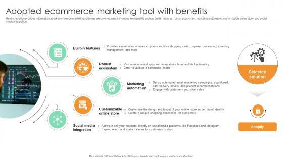 Mentioned slide provides information about ecommerce marketing software selection reasons. It includes key benefits such as built in features, robust ecosystem, marketing automation, customizable online store, and social media integration.Boost your pitch with our creative Adopted Ecommerce Marketing Tool With Benefits Comprehensive Guide For Marketing Technology. Deliver an awe-inspiring pitch that will mesmerize everyone. Using these presentation templates you will surely catch everyones attention. You can browse the ppts collection on our website. We have researchers who are experts at creating the right content for the templates. So you do not have to invest time in any additional work. Just grab the template now and use them. Mentioned slide provides information about ecommerce marketing software selection reasons. It includes key benefits such as built in features, robust ecosystem, marketing automation, customizable online store, and social media integration.